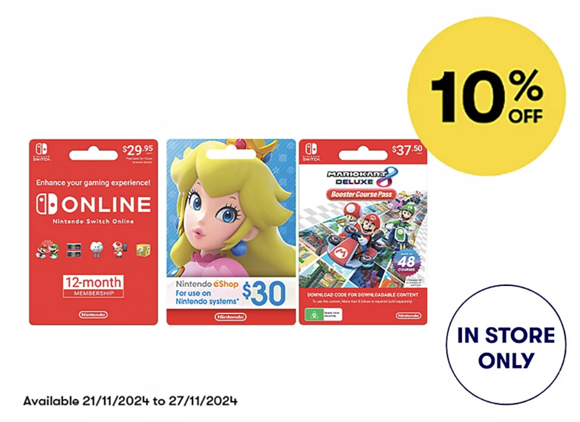 Big W has 10% off all forms of Nintendo digital credit, including eShop, Switch Online Subscriptions and DLC. Only available in store.