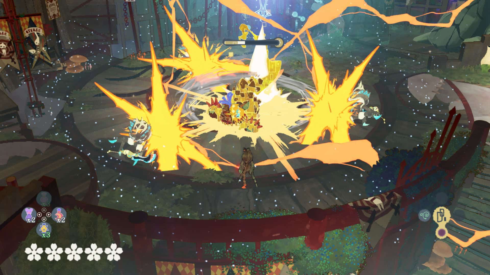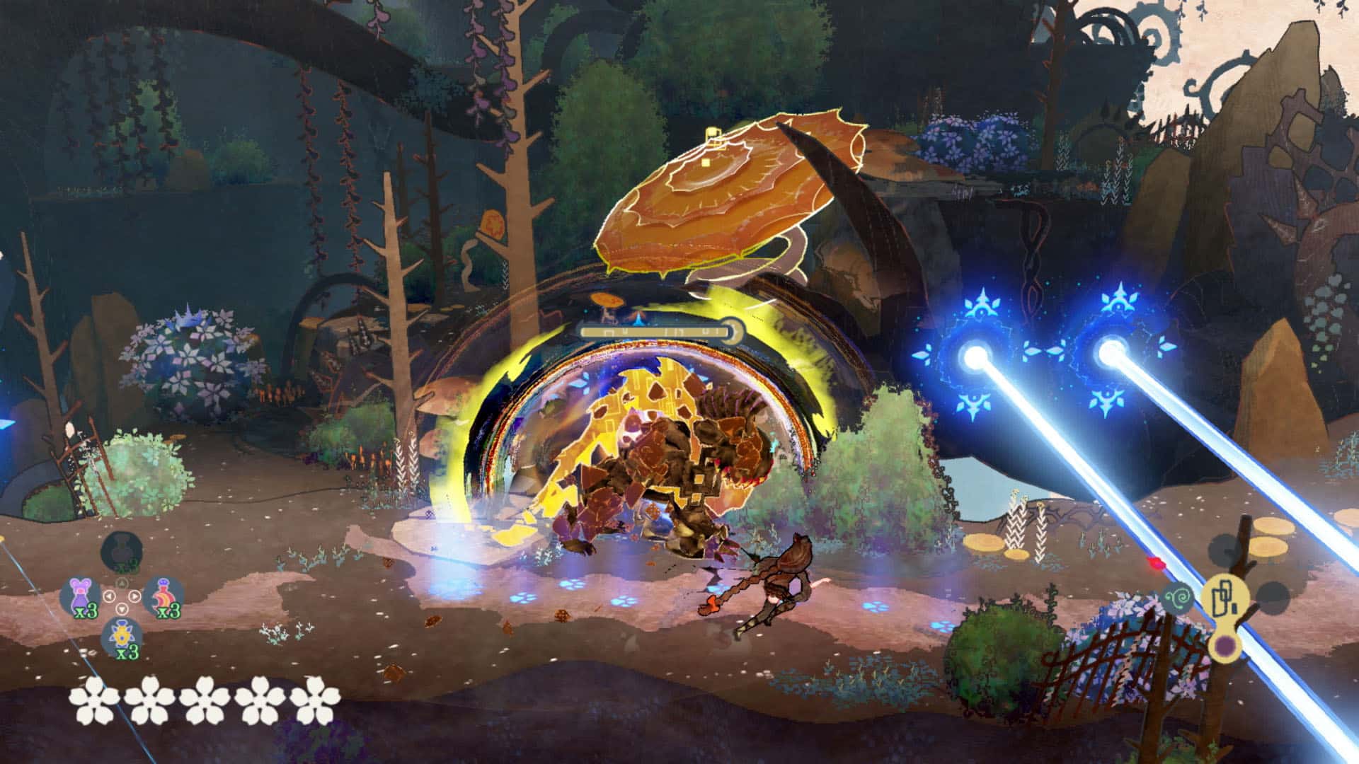 You’ll get to a point in the game where you can purchase new moves or upgrades to increase Cereza and Cheshire’s abilities. I never found myself too short on either character’s currency. Still, both require harder-to-find items to unlock an increasing number of skills. Sticking to the main path, you will come across very few of these items. Outside of some initial moves locked behind this requirement, I didn’t see any more through the last half, even with some backtracking and clearing any Tír na nÓg in my path. It was a shame that I could see some fun new moves that might finally mix up the combat, but it just wasn’t to be. As I continued through to the end of the game, there was the additional realisation that the moves I had unlocked much earlier worked just fine outside of an extra attack. This brought me to the realisation that so much can easily go unused in Origins. You can use four different potions to fill meters or buffs, and only the health potion is necessary. Many upgrades have minimal impact or go unused the whole game.