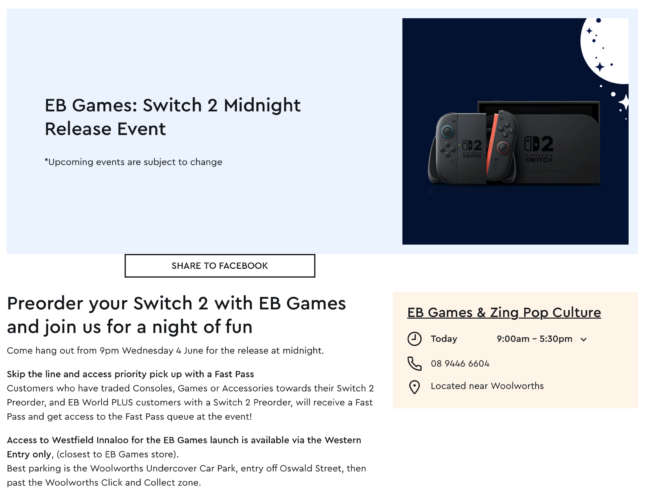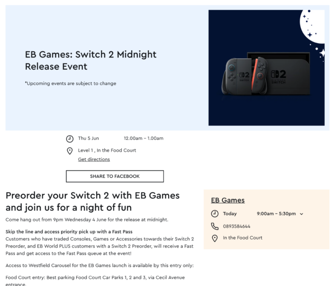 Hell has apparently frozen over — there are midnight launches for the Nintendo Switch 2 happening in Western Australia. First spotted by Press-Start, the websites for two Westfield centres in WA list Midnight Launch events at EB Games next week: Innaloo and Carousel.
