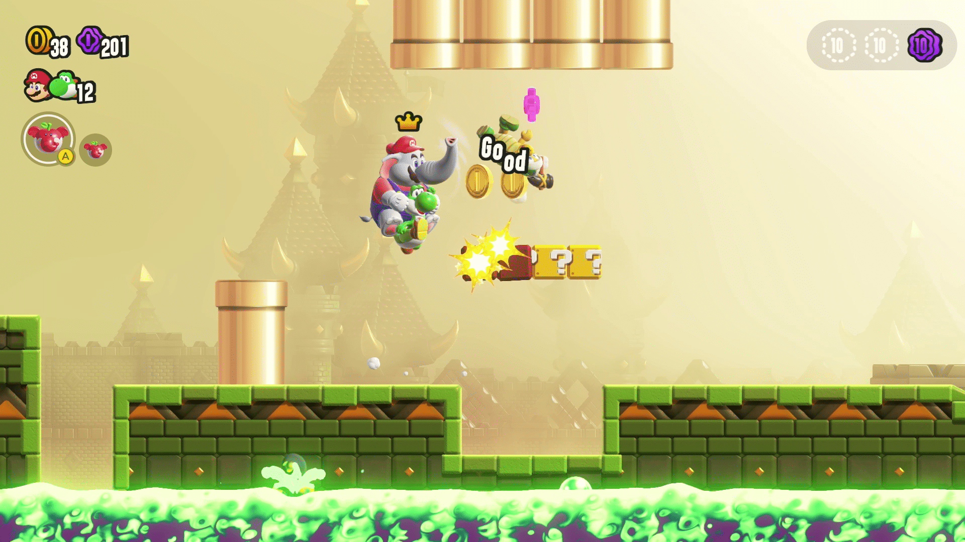 Speaking of Elephant form, all characters can turn into an Elephant now. There’s a new Bubble and Drill power-up as well. The titular effect, Wonder Effects, is enabled when you touch a WondeR Flower. This can make stages title, pipes move, change perspective (top down!), or players can ever float through space or turn into a Goomba.