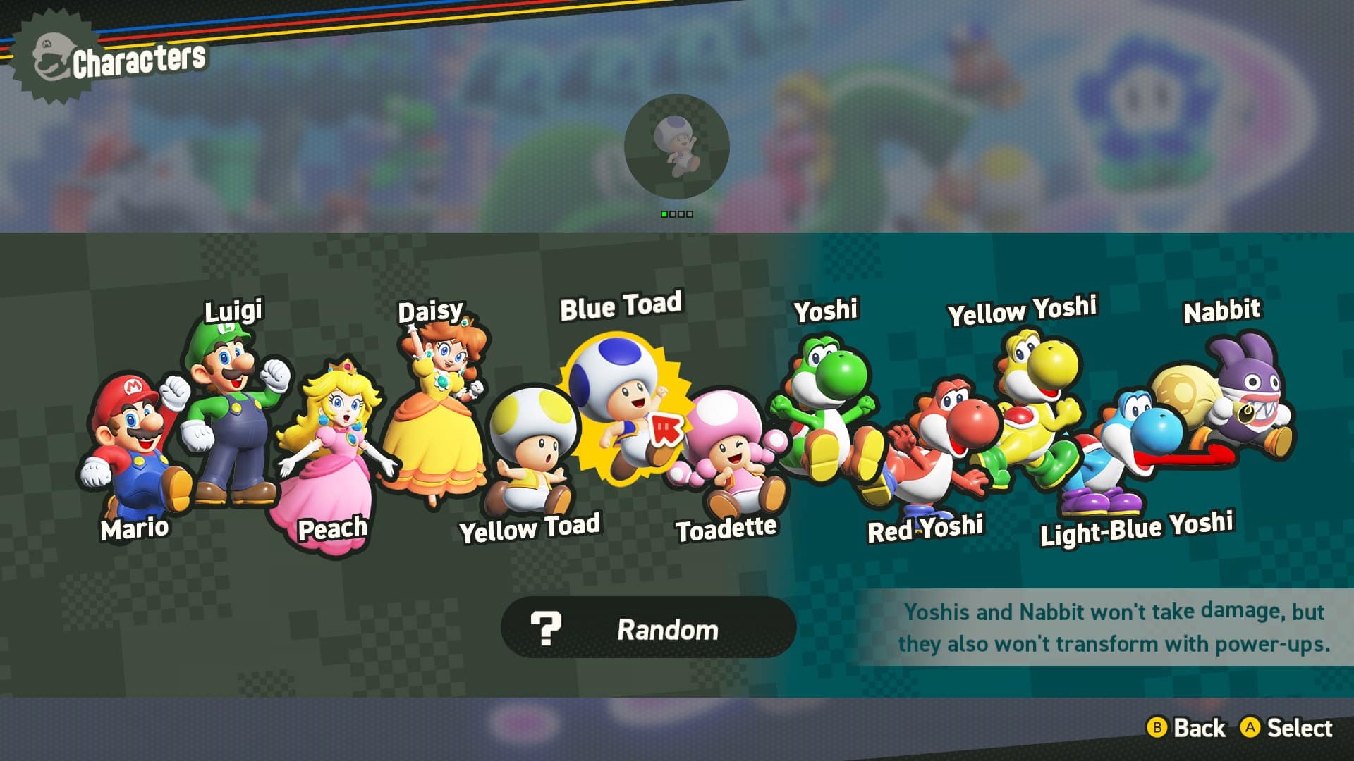 Playable characters include Mario, Luigi, Peach, Daisy, and two different Toads, Toadette, who all control the same. You can also play as Yoshi or Nabbit and not take any damage with these players. Yoshi also has his flutter jump. All the characters can also ride Yoshi, including when in Elephant form.