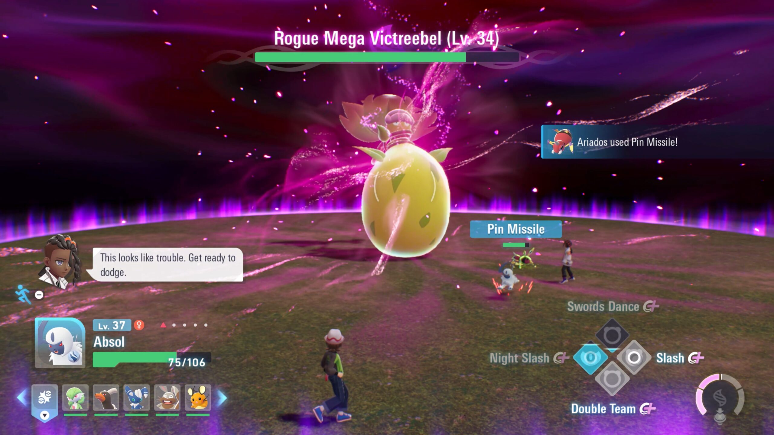 The Rogue Mega Victreebel battle came with a sizable HP bar to whittle down. This becomes much more manageable as you collect Mega Evolution energy in the arena and use it for your own Mega Evolutions. This allows your Pokémon to do more damage, especially as it upgrades some moves into Plus Moves. As long as you can keep collecting Mega energy, you can keep your Mega Pokémon in a more powerful state.