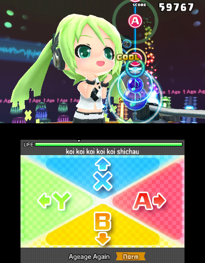 There’s two ways to play the Rhythm sections of this game: through the Touch screen, or with the Buttons. Button mode is exactly what you would expect; notes come through on a highway that follows a set pattern as it twists and turns on the screen, and you use the ABXY and ←↑→↓ buttons when the appropriate prompt is on screen. Project Diva veterans will be most familiar with this mode, as that entry allows you to either use the directional buttons or face buttons to hit the note (ie Y and ← are considered the same notes and can be used interchangeably).