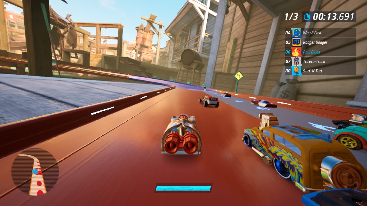 Turbocharged has also increased your car’s mobility and attack power through the ability to jump and side bump. The jump is often needed to leap over some obstacles or clear a gap that doesn’t have a ramp. The side bump is generally for charging into other racers, hopefully sending them off the track or into one of the obstacles. The changes that have happened to the tracks to make the jump button matter feels like it’s for worse. To perform either manoeuvre, you need to use a small portion of your boost bar, which can really mess up a race if you’re running too low on your meter to jump. In some cases if you don’t get a boost start you might as well restart as you won’t clear the obstacle.
