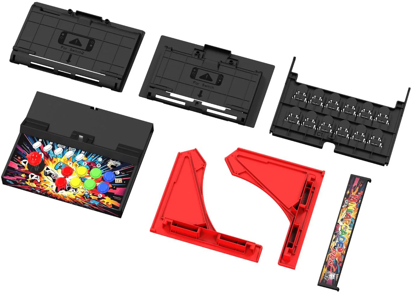 The Mini Arcade Pro is a portable arcade cabinet (a mini one even), with an arcade stick and buttons set up in a small arcade cabinet frame. The cabinet is the right size for the Nintendo Switch handheld screen to slot into the Mini Arcade, and completes this portable arcade cabinet setup.