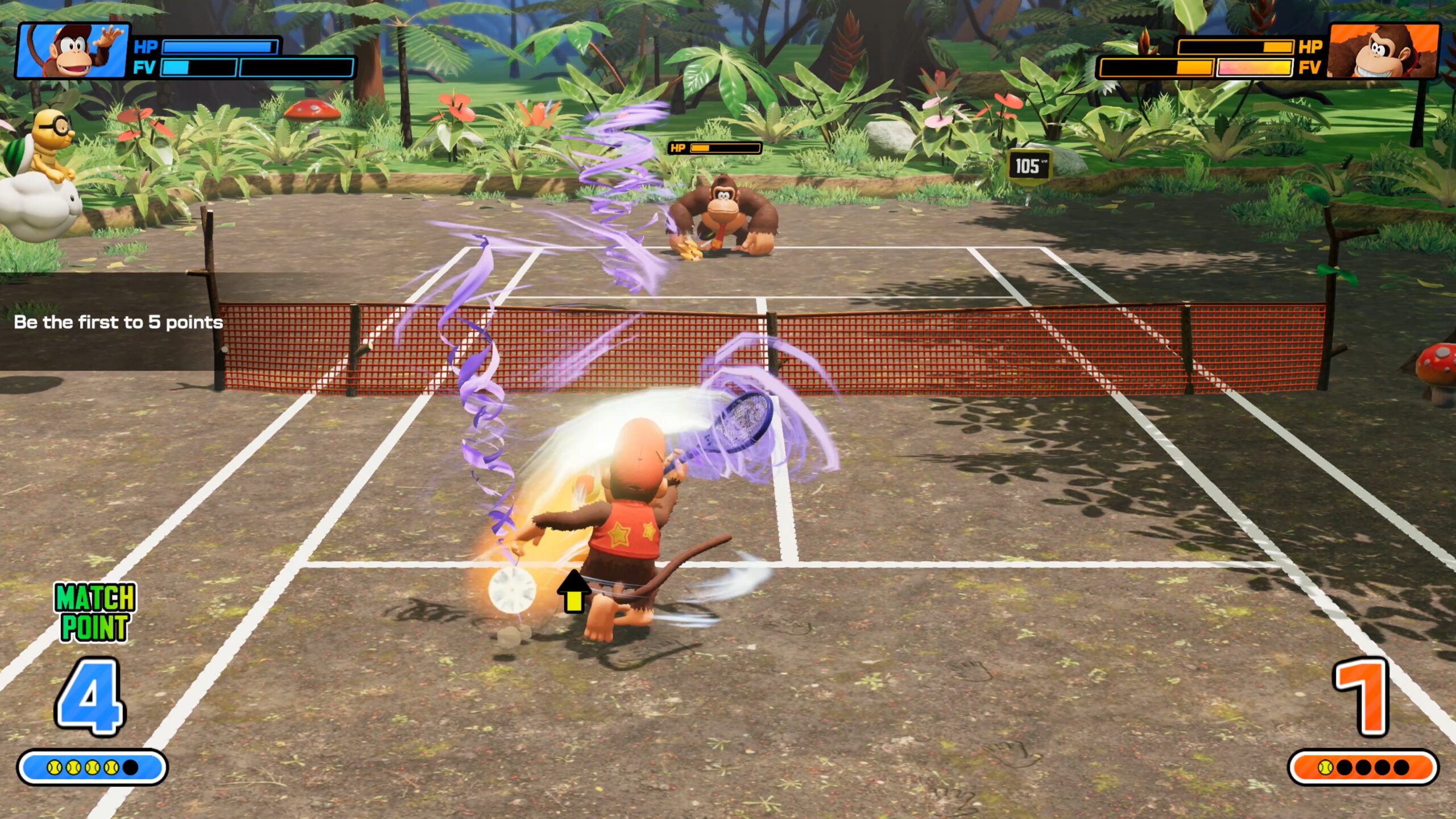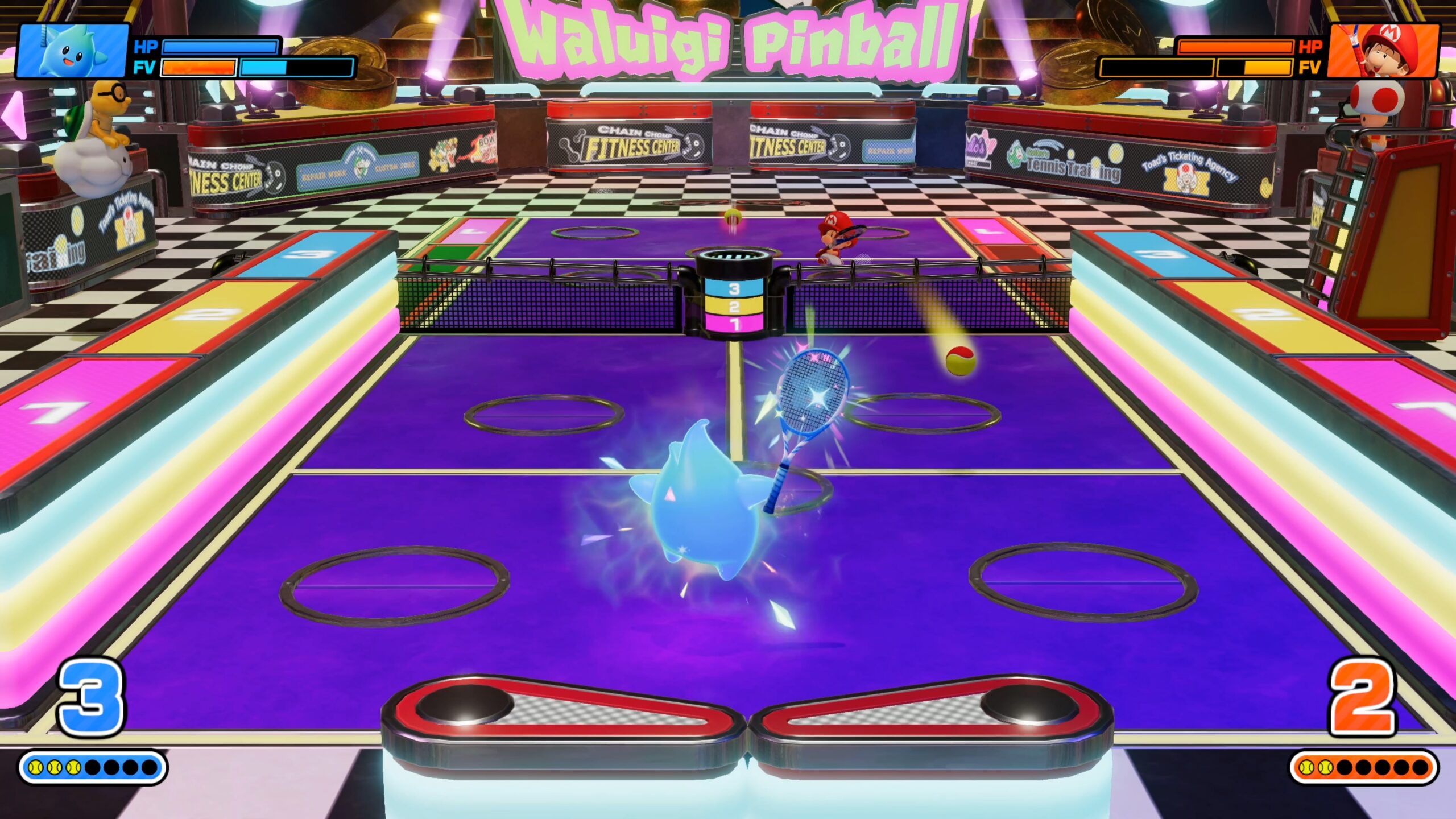 Fever also introduces health bars into the mix. If you get hit enough times by Fever Racket effects, you or your partner in doubles can be taken out of the match and put on a cooldown. Some Fever Rackets work better with certain characters than others. For example, duplicating a larger Donkey Kong or Bowser with the Shadow Racket makes covering the court with these slower characters much easier, whereas more nimble characters can more easily avoid mud or molten slag effects on the court.