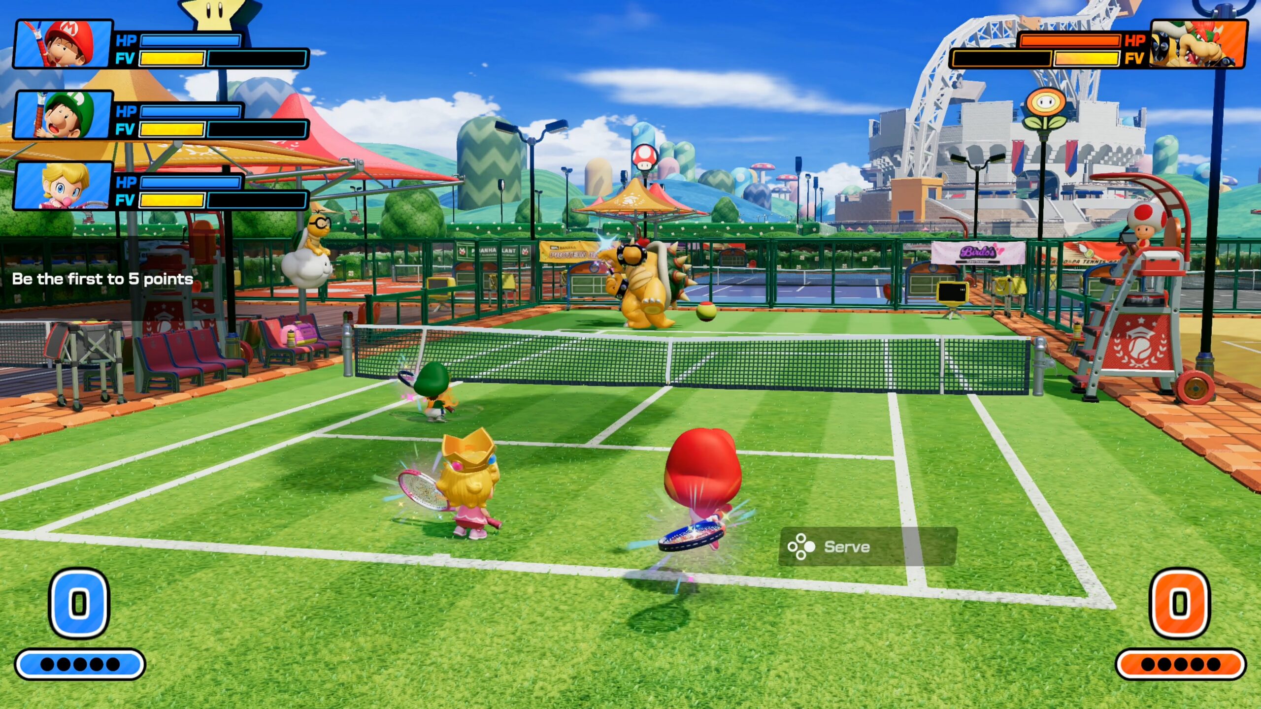 Fever Rackets are triggered by hitting a Fever Shot when your Fever meter is filled. If the shot lands, the racket’s effect is applied to your opponent unless they successfully counter it and you fail to hit the return. Some racket effects cannot be blocked at all, meaning they will affect you no matter what. If you do not manage to counter, you could be hit with a court full of Mini Mushrooms, sludge, fireballs, and other modifiers. It gets especially intense in doubles, as you are not only contending with playing tennis but also dodging things flying all over the court.