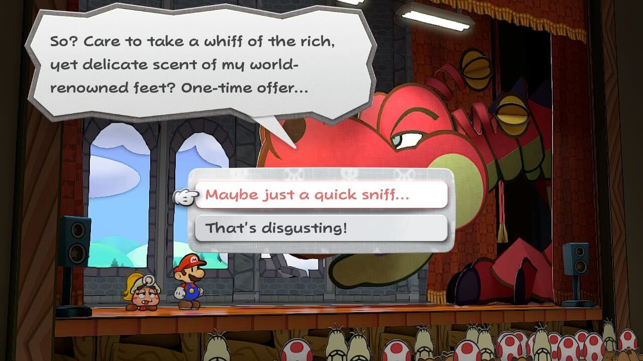 So, how is it actually playing the game? It’s very much a Paper Mario game, and still one of the best ones. It is full of character and charm, with a story filled with humour and some surprisingly touching moments. The turn-based combat is still enjoyable, with mechanics like the timing-based ‘action command’ and ‘stylish’ moves to fill up your star meter. The stage show layout that combat takes place in makes for other quirks that keep fights involved. When you hit hard enough or use certain attacks you might knock down the scenery on the enemy, or knock loose some jets of freezing air to freeze them up. Be mindful that you are just as vulnerable to the same attacks, with the audience watching on potentially throwing objects or messing with the backstage. There’s also some strategy involved when you see enemies holding items, if you don’t deal with them quickly they could use them to hurt or debuff you.