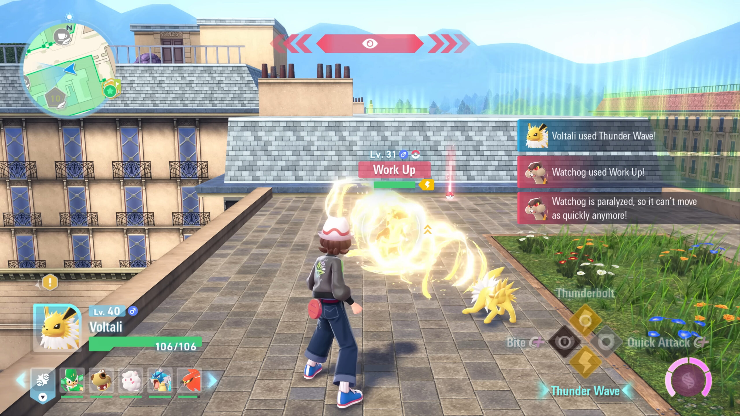 The way your Pokémon move and the attacks they have access to change how you use them in battle quite significantly. My starter Pokémon, for example, had access to Razor Leaf and Disarming Voice, which meant it could attack from afar without having to get too close to Pokémon that deal damage in a circle around them, like Earthquake, or moves that have a short range, like Thunder Wave. A Heracross I picked up, on the other hand, had to get up close and personal for all of its attacks, leaving it open to taking more damage, but it also had access to moves like Megahorn, which quickly dashes to close gaps from a distance.