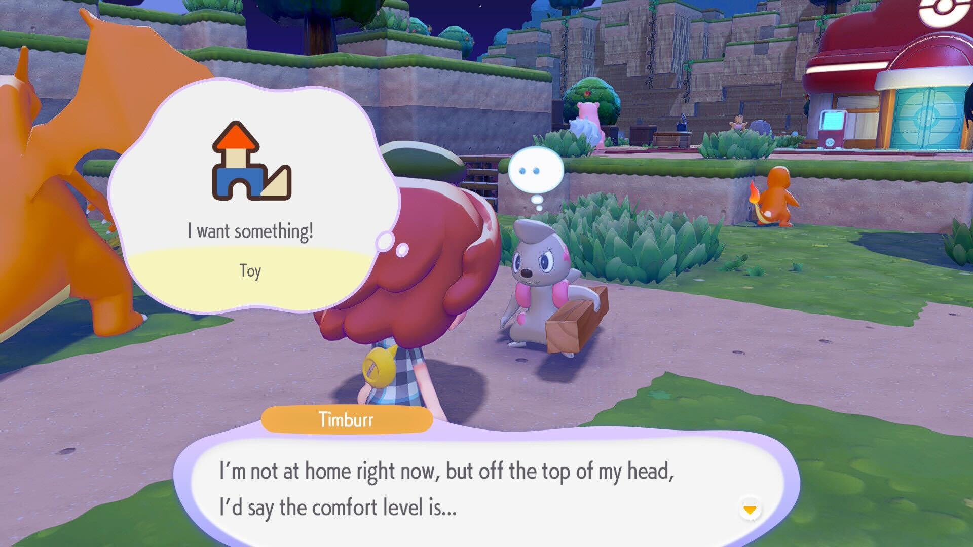 Some Pokémon are awfully picky, though. A particularly troublesome Gardevoir, for example, wanted her home to be brighter, and would not stop asking for more light until her home was practically made of streetlamps. Having unhappy Pokémon doesn’t prevent you from doing anything, exactly, but making your Pokémon happy improves the environment level, which unlocks more items to craft and, sometimes, new story options. So while that Gardevoir was, in my opinion, far too pushy about having more light, I couldn’t let her request go ignored. I dutifully built a windmill so I could power more electric lamps, and I filled her home with them. Then, she was happy.