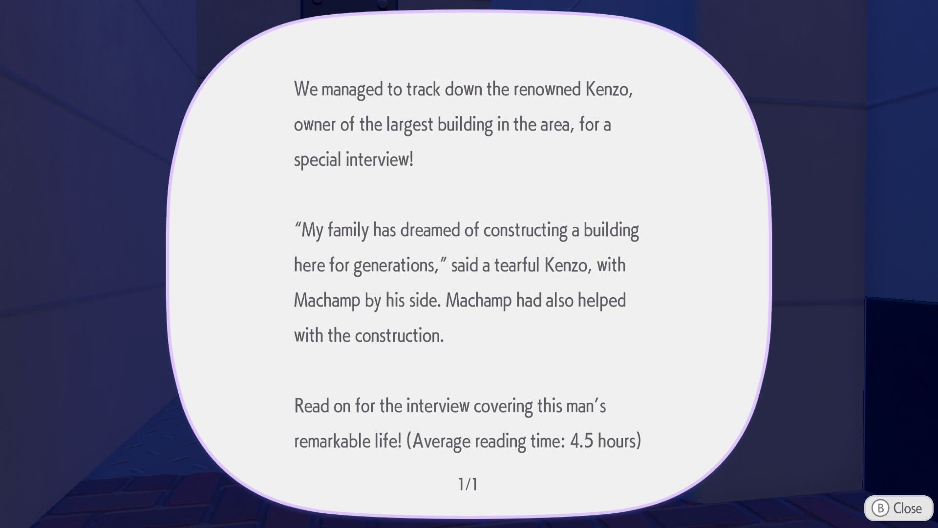 Much of my time in Pokopia was spent exploring these ruins. Scattered throughout the world are notes, logs, newspapers, and journals from the region that came before. There are interviews with gym leaders like Lt. Surge, a news story about the tallest building in Vermilion and the Machamp that built it, notes about the mysteries of Mt. Moon. These aren’t just nostalgia-bait references meant to tug on the heartstrings of thirty-somethings that grew up playing Pokémon Red and Blue — though they are that, in part. But they’re also signs of genuine respect for the region, and the franchise as a whole. For the first time in Pokémon’s history, we get to see what happened to Kanto after the events in Gold and Silver. We see evidence of growth, of a changed region that moved on from the image that Game Freak has spent so long refining and enshrining.