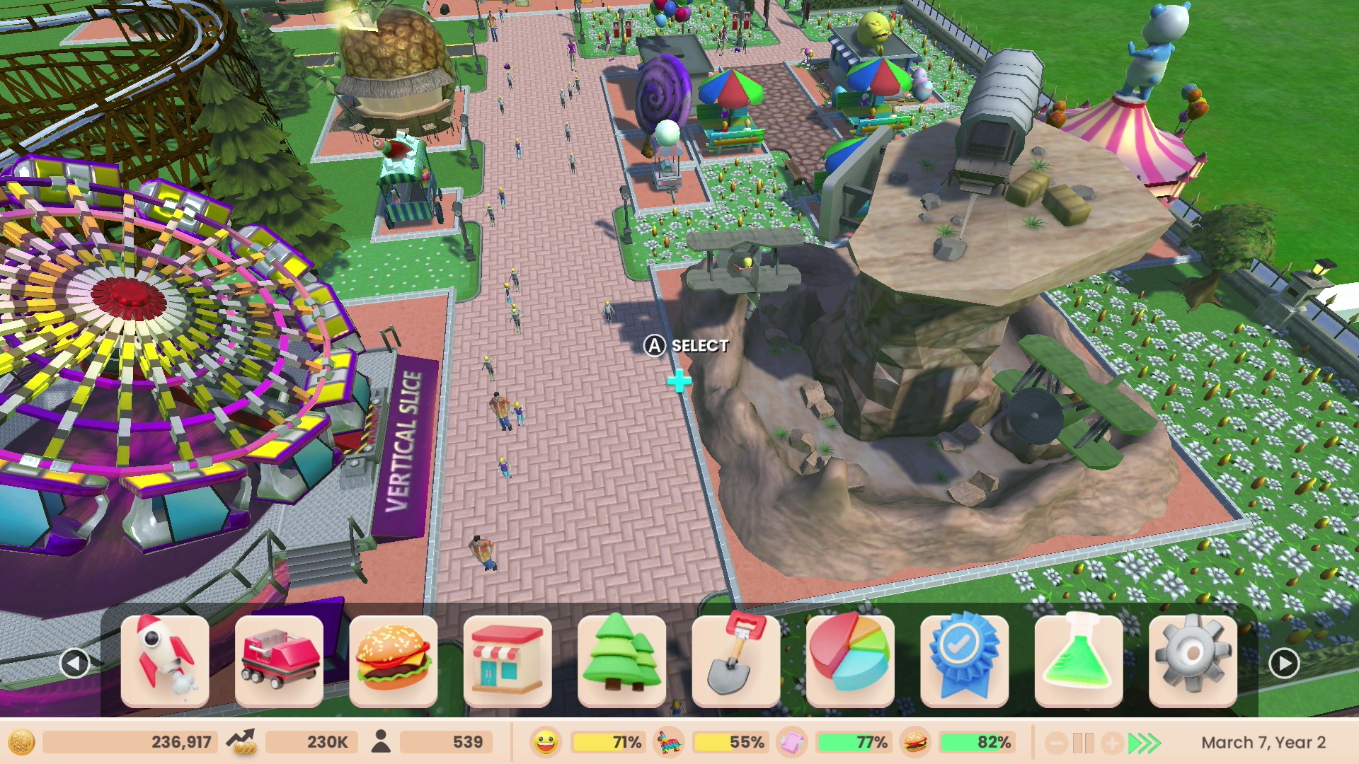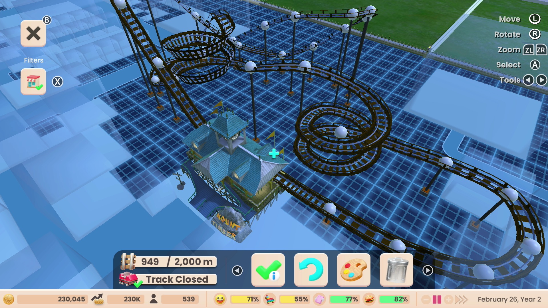 The interface has been perfectly adapted for the Switch and a controller. You can make a nice looking park, with exciting rides, and place buildings where staff look after the park and the people will flock in. There’s a fully formed Rollercoaster creator, which, while simple, lets you make something your own, even if you can’t ride it. Unfortunately, without the timed and gated content unlocking, almost everything is so simple, and there’s virtually no challenge to the game. The game becomes a simple task of getting the bars at the bottom of the screen to stay up. Eventually, the game breaks down as well because things will wear out, and you’ll have to drop prices on rides, or people will be unhappy. But that’s about as far as the management goes. There’s no hiring and firing of staff, buying supplies, or restocking stores. It’s all just done for you.