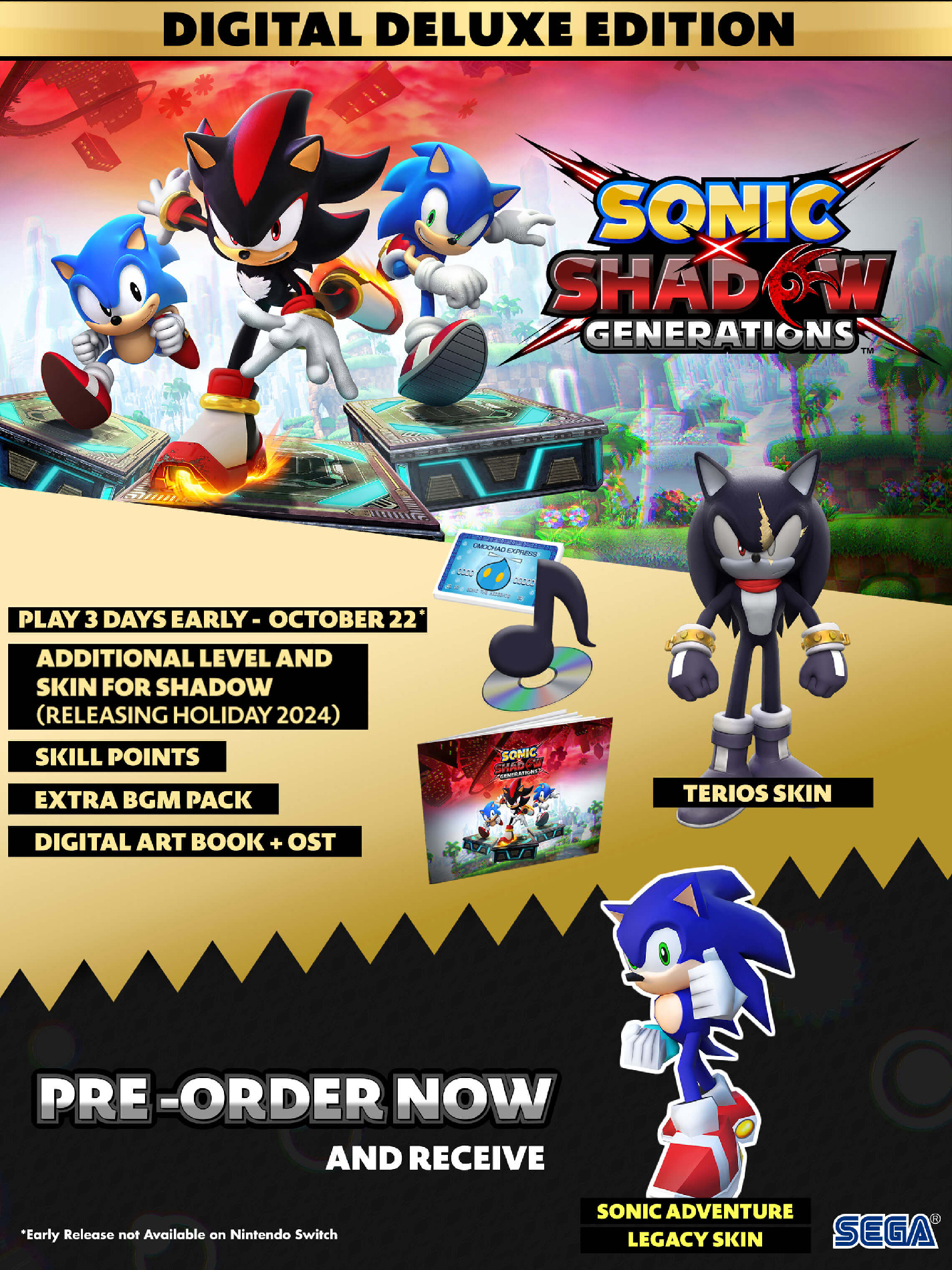 The game is coming with a Digital Deluxe Edition which will let you play the game three days early (but not on the Switch), has a digital art book, soundtrack and more skins. One of those skins is a Terios skin based on Shadow’s original concept artwork. There’s also a skin for Sonic based on Sonic Adventure, but you get that with any preorder of the game.
