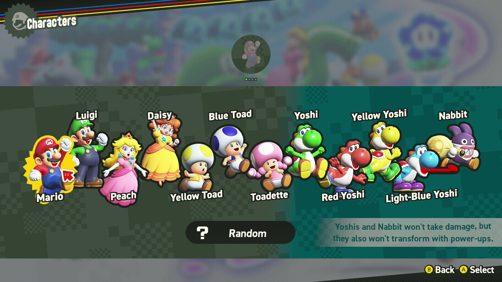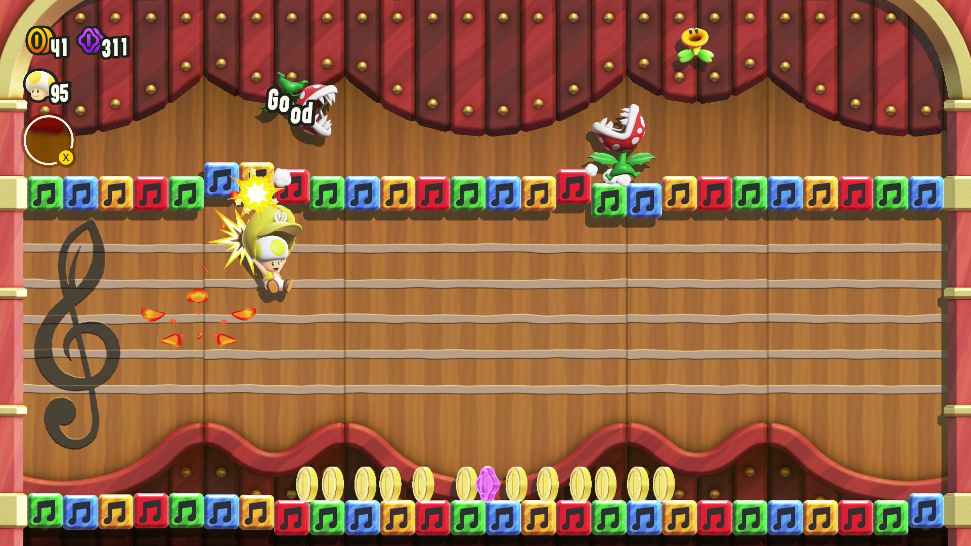 The only exception here is Yoshi and Nabbit; they’re practically invincible aside from one or two exceptions. Yoshi has his flutter jump and ability to snatch up enemies with his tongue. Nabbit is even more agile than everyone else. They’re an excellent balancer for multiplayer for people who may be on a different level than a more seasoned player. There’s no punishment or marker against a save for using Yoshi or Nabbit. So much has been done away with in Wonder; even the game no longer has a scoring system, nor do levels have a 300-second timer. It frees things up.