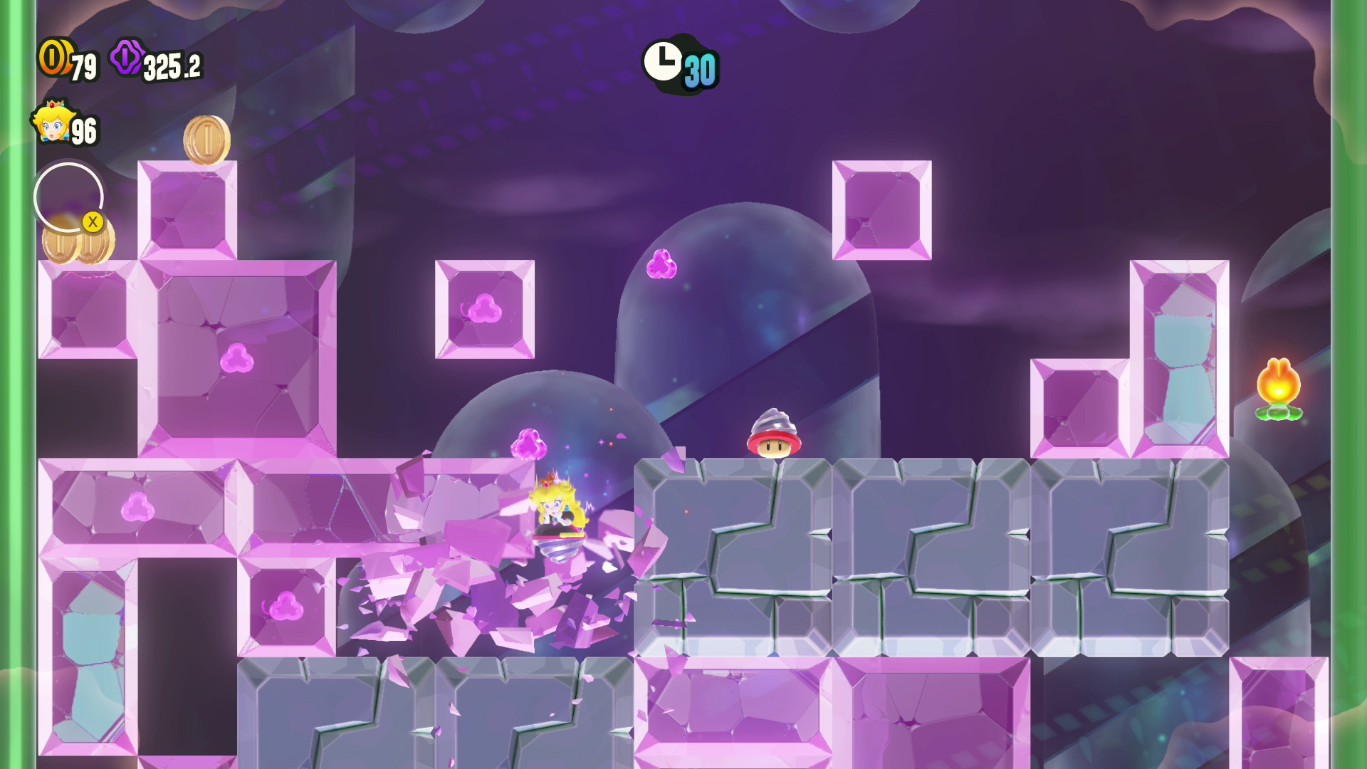 The new Badge system is similar to the badges from Yoshi’s Woolly World. Each badge is attached to the travelling Prince with you, and you can unlock them by purchasing them from the store or from Badge Challenges. These courses are based around one particular badge; you’ll unlock the badge by completing it. The badges can then be used on any other level, and it is up to you to find which badge will help you along the way. Keep dying? Get a head start with the Auto Super Mushroom, and it starts the level with an already powered-up character.