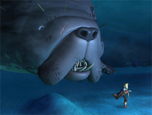 The first episode of the series started off great and the second one followed it up well. This third one, Lair of the Leviathan, lets the new series hit its stride. It takes place directly after the last episode, after surviving the siege of Spinner Cay and heading out on the Screaming Narhawl to find the La Esponja Grande. After a brief recap of the story from the Voodoo Lady, the game starts off inside the giant Manatee that swallowed them up at the conclusion of the last episode. They aren’t alone though, with missing explorer Coronado De Cava and his crew stuck in the manatee as well.