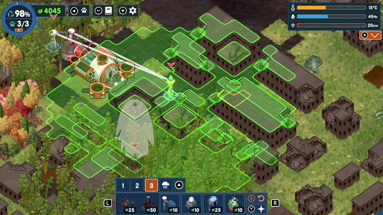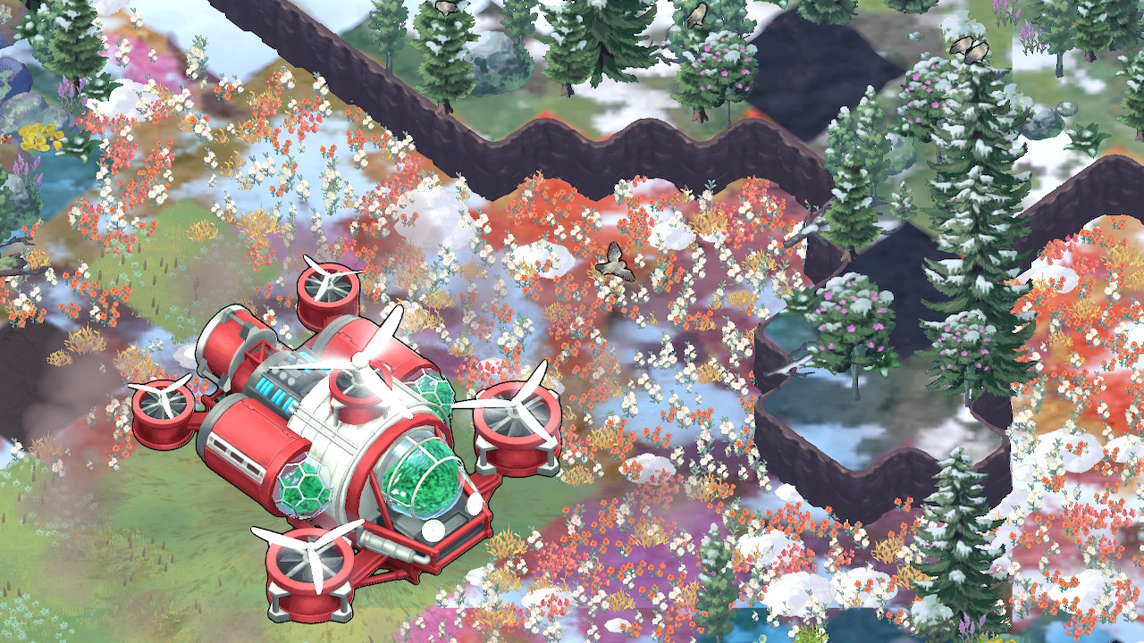 Once your ecosystem is back in the right conditions, you can introduce new plant life, and animal life will thrive. When everything is done, it’ll be time for the cleanup. The cleanup, for me, is the most annoying part of the game; you have to make sure everything you place down is removed, but in doing so, you’ll often have to make new buildings so the cleanup bot can get to all the far-flung edges of the map. Later stages also have a cleanup drone, which makes it a little easier, but unless you plan out your buildings well, you’ll still have to make a mess again to clean up. Also, I hit a bug in the post-game where I couldn’t upgrade the cleanup drone, which would make repeat playthroughs more fun. It’s a fine line between the game’s ethos to create a lovely human-less world versus having to place buildings in specific locations just because of the game’s mechanics.