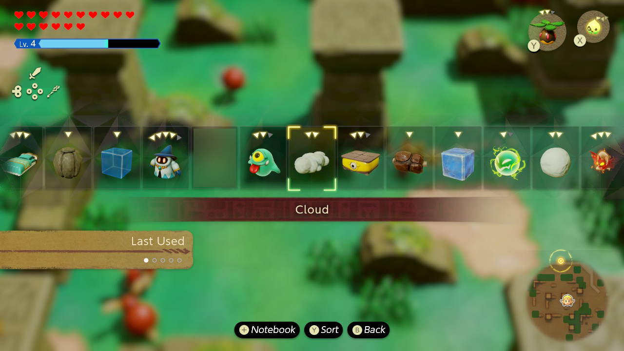 As much praise as I have for Echoes of Wisdom, I do have some small complaints, too. The UI isn’t really up to scratch, in my opinion, when it comes to selecting echoes. You know how, in Breath of the Wild, you can press right on the D-pad and scroll through your weapons? Imagine that, but instead of 6 weapons, you have a single row of over a hundred echoes. There are ways to sort these, but you can’t favourite them, so if you want a specific echo, you have to scroll through the entire list to find it and hope you don’t accidentally select the wrong one. If you do, you’ll have to scroll through the list again. There is a grid-based selection in the main menu, but when you’re in the thick of it, opening up the main menu isn’t really ideal.