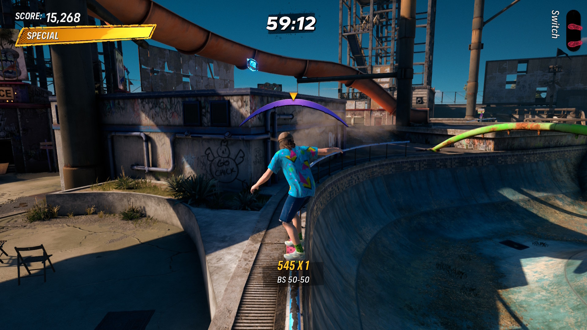 By now I hope we’re familiar with what a Tony Hawk’s Pro Skater game is, a third-person skateboarding game where you score points for doing tricks. Each level is a veritable playground of geometry and buildings/structures, allowing you to perform even more tricks. You have a bunch of goals for each level in the form of scoring high amounts of points, collecting the letters S-K-A-T-E and collecting other items or triggering events to complete a goal. Some levels are Competitions, where the focus is on scoring your best across three heats with more limited time.